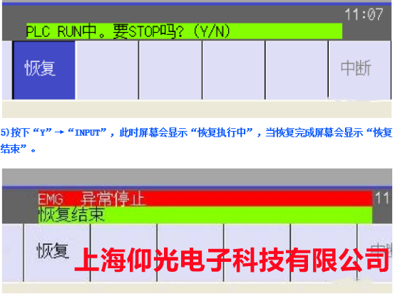 4.選擇完裝置后,按下“恢復(fù)”→“INPUT”→“Y”,此時(shí)屏幕顯示“PLC RUN。要 STOP 嗎?(Y/N)”