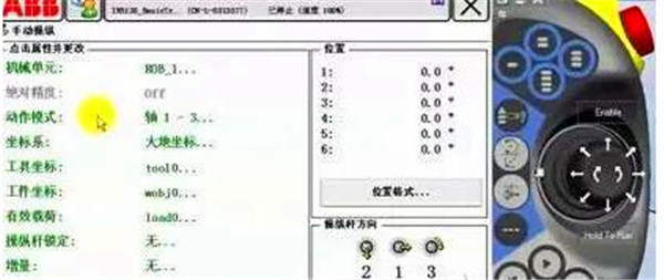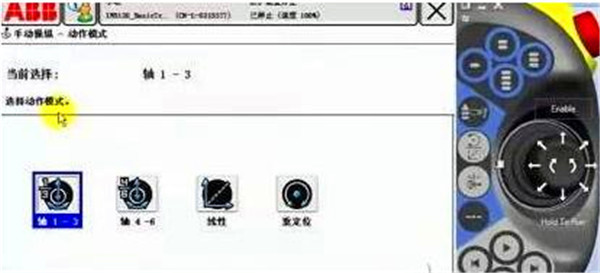 動作模式中,選擇軸1-3。按下使能器到第一檔,手動操縱桿左右方向可以控制Axis1運(yùn)動,上下方向控制Axis2運(yùn)動,旋轉(zhuǎn)操縱桿控制Axis3運(yùn)動。